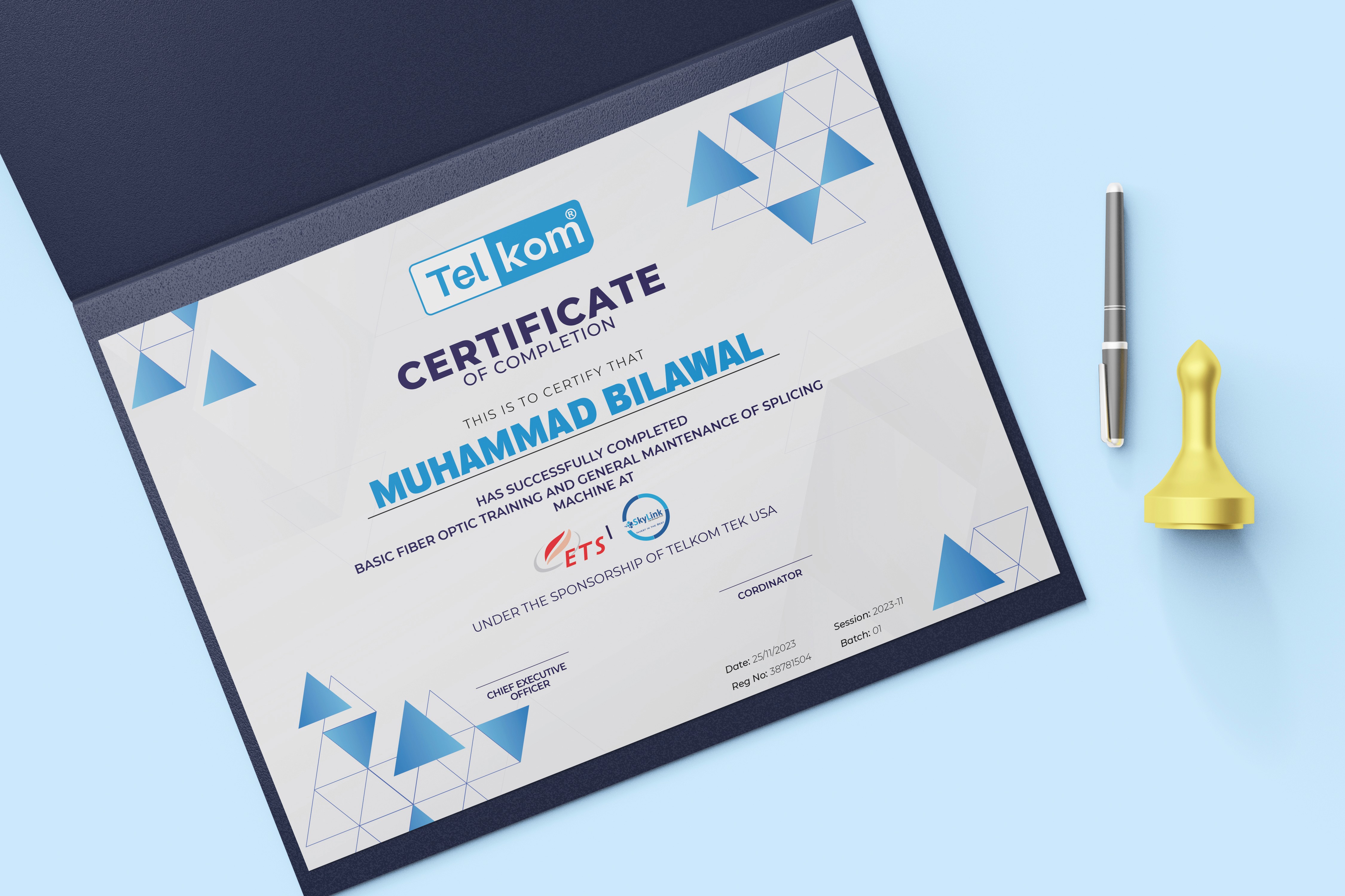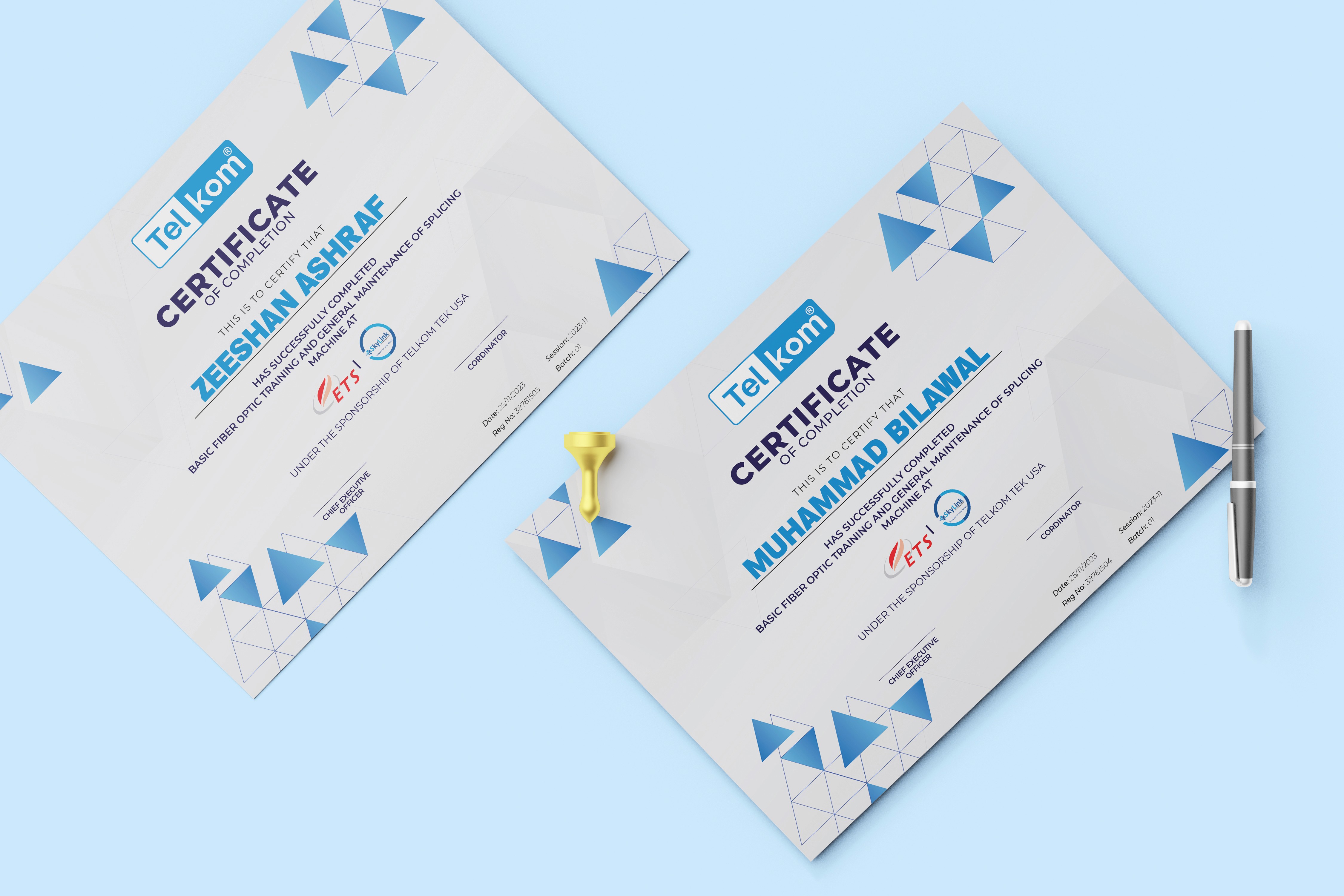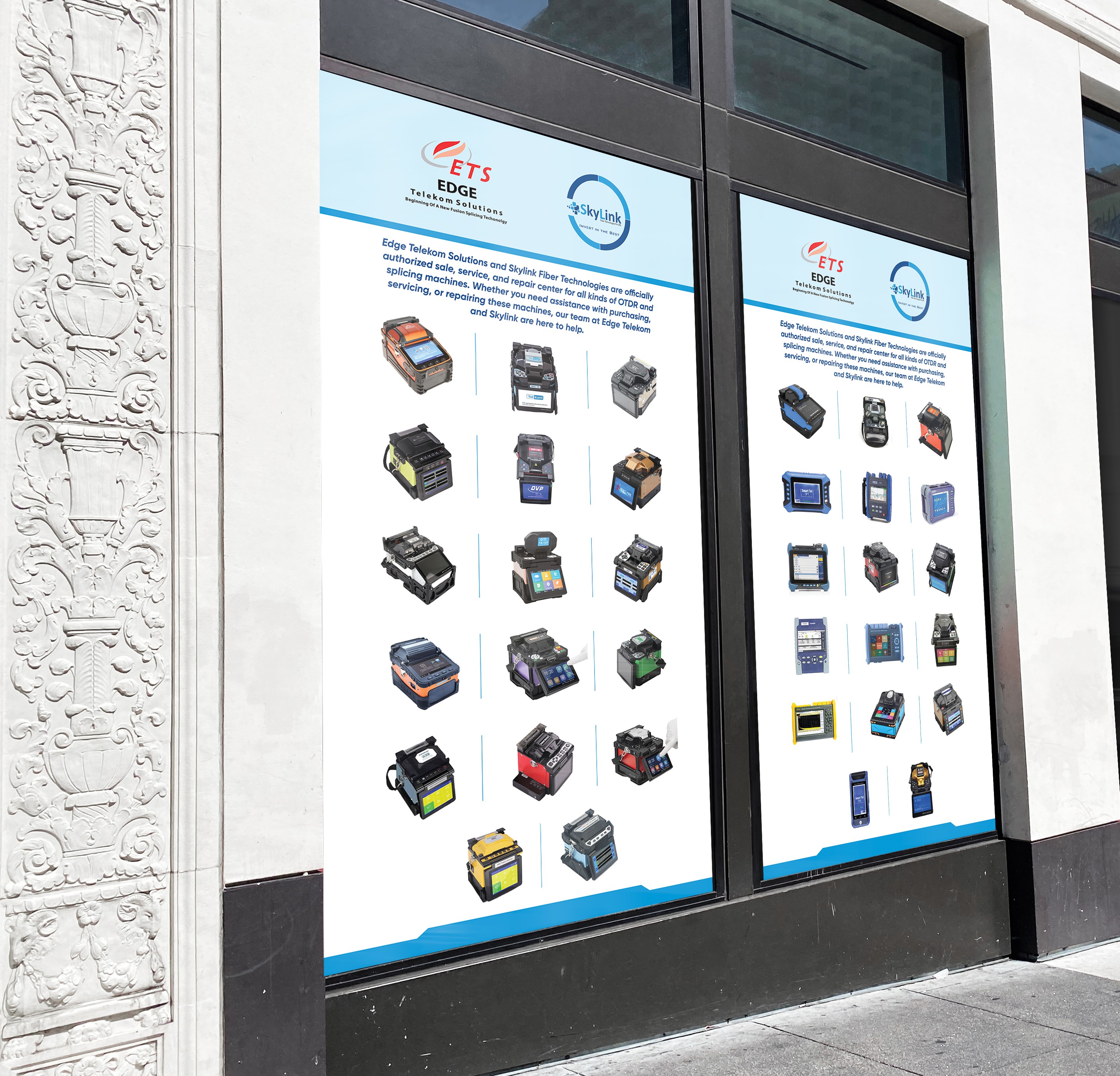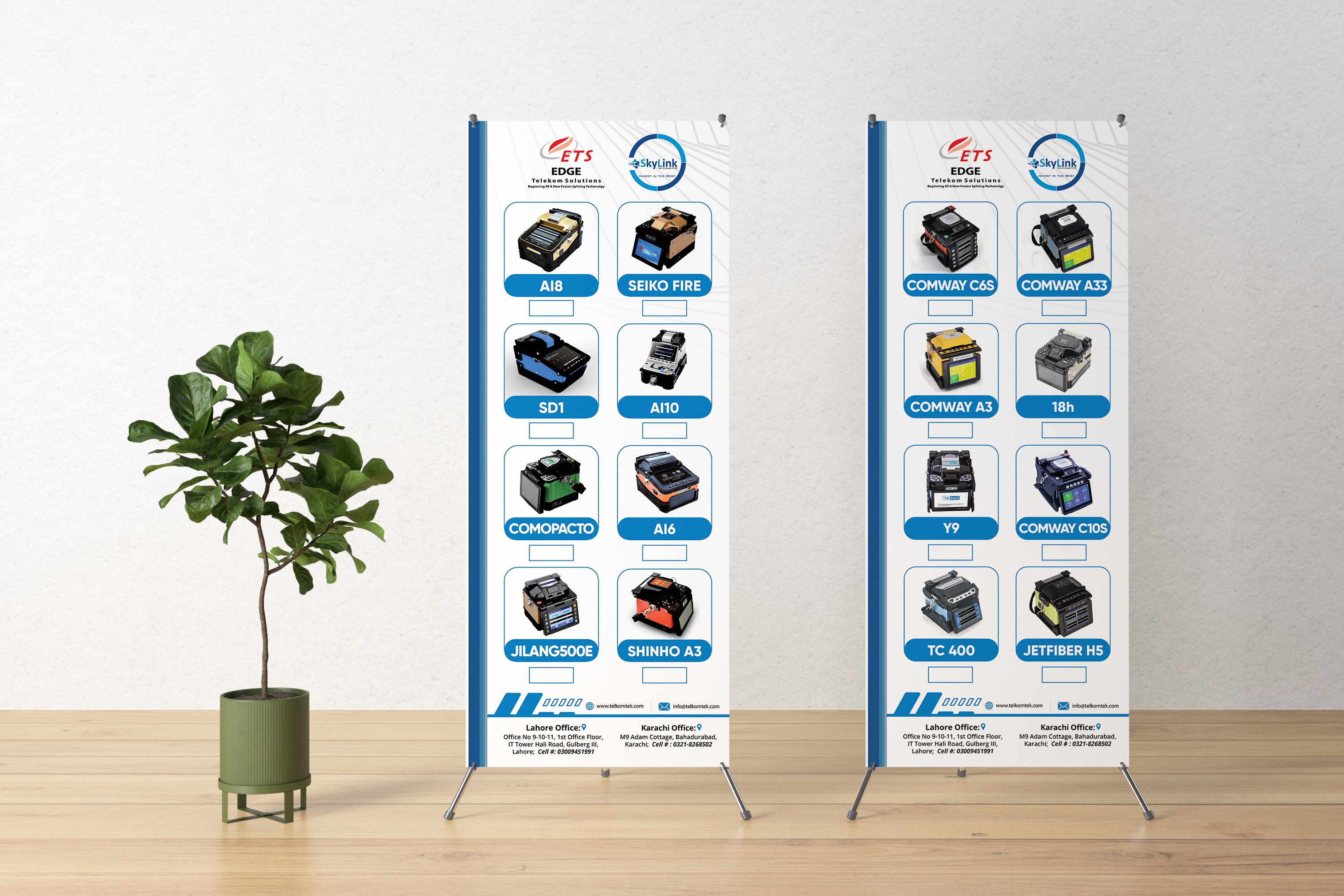 Branding project for Edge Telekom Solutions (ETS), encompassing roll-up stands, standees, certificate designs, employee cards, and door skins for comprehensive branding.