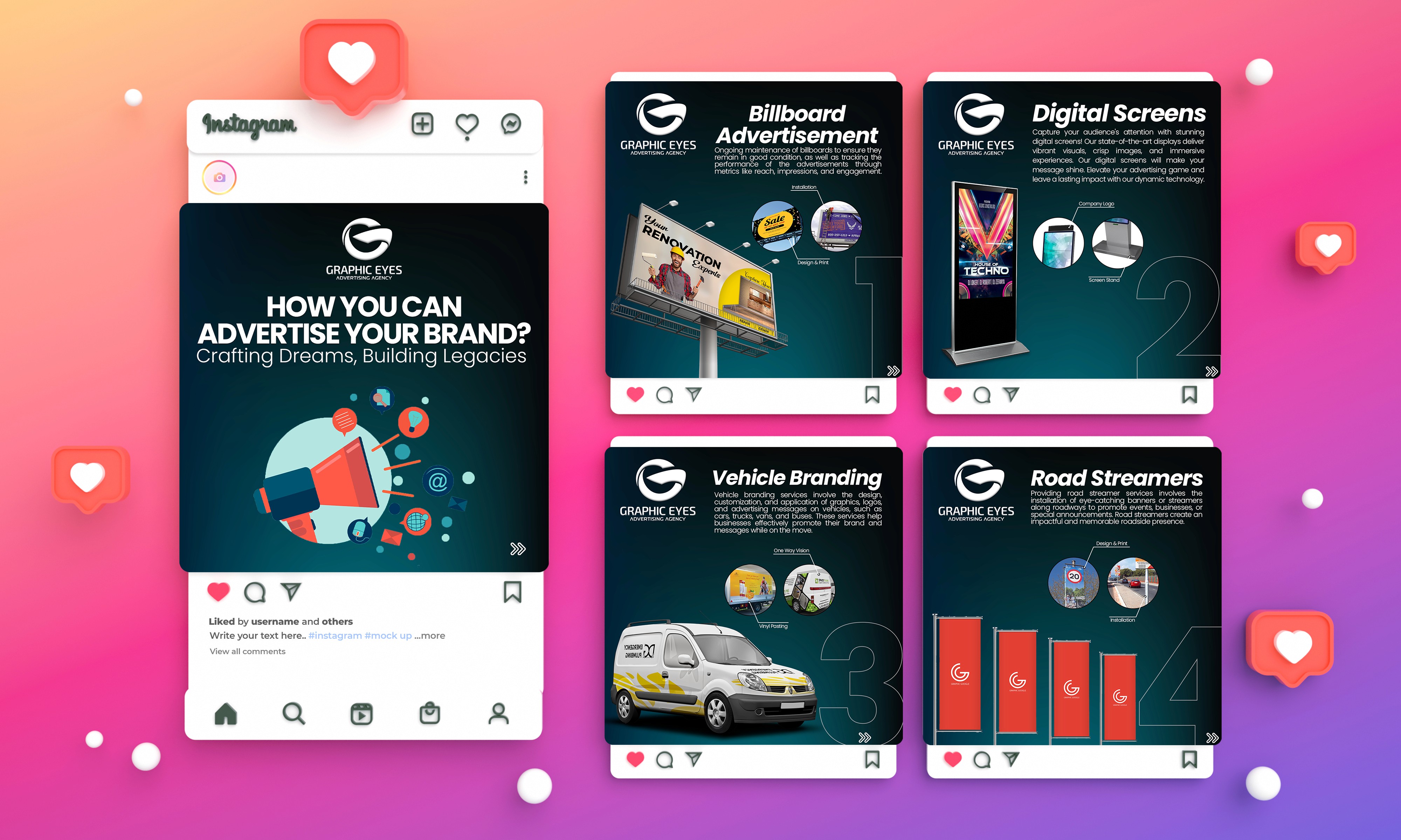 I offer comprehensive social media services for Graphic Eyes, encompassing various content types such as inspirational, promotional, educational, and entertaining posts. By delivering high-quality visuals, these services are tailored to enhance brand engagement, drive significant revenue growth, and boost sales.